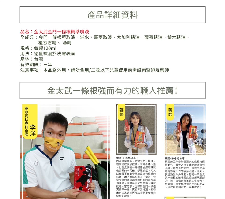 成分:金門一條根萃取液、純水、薄荷精油、尤加利精油、