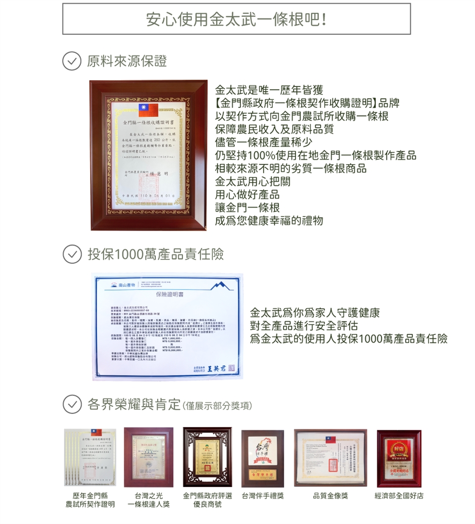 【 金太武一條根】為歷年皆獲金門縣政府農試所契作認證品牌,品質優良