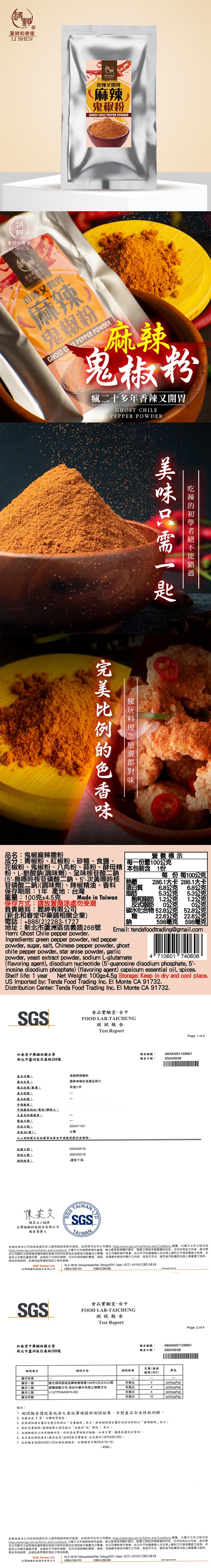 成份:鬼椒粉、青椒粉、紅椒粉、花椒粉、八角粉、蒜粉、食鹽、酵母精粉、L-麩酸鈉(調味劑)、呈味核苷酸二鈉(5’-鳥嘌呤核苷磷酸二鈉、5’次黃嘌呤核苷磷酸二鈉)(調味劑)、辣椒精油、香料
