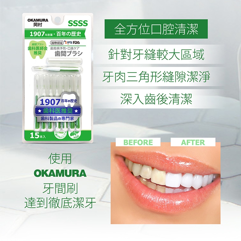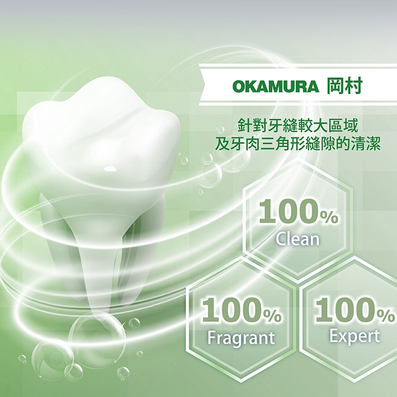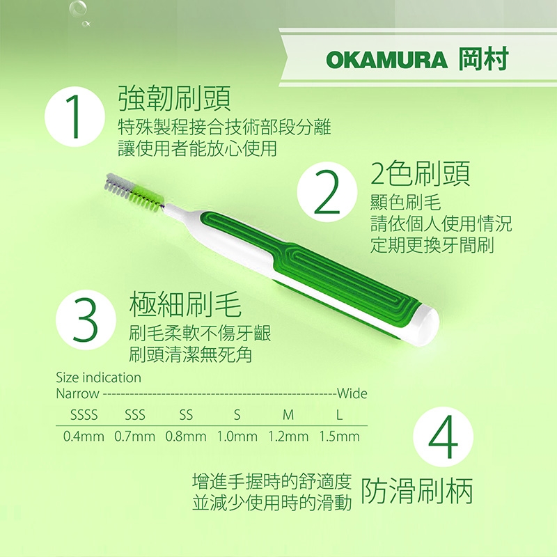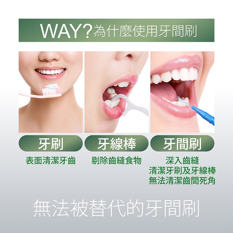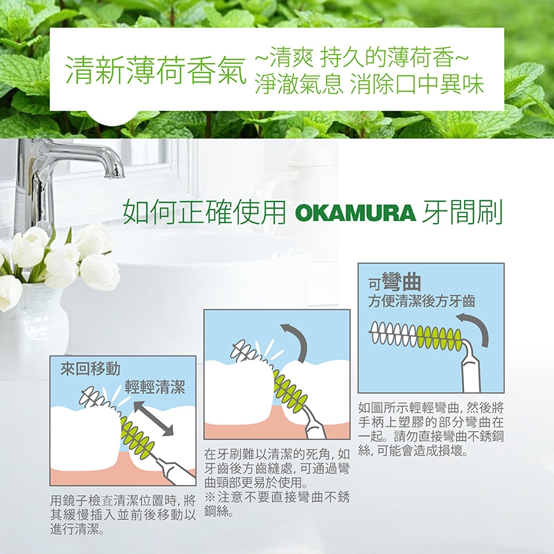 用法:請選擇刷毛尺寸合適的牙間刷。將牙間刷順著牙齦進入縫隙後刷頭在齒縫間前後輕移清除牙縫中食物殘渣也可彎曲前端對抗齒間死角加強清潔效果。使用完畢請以清水洗淨晾乾。