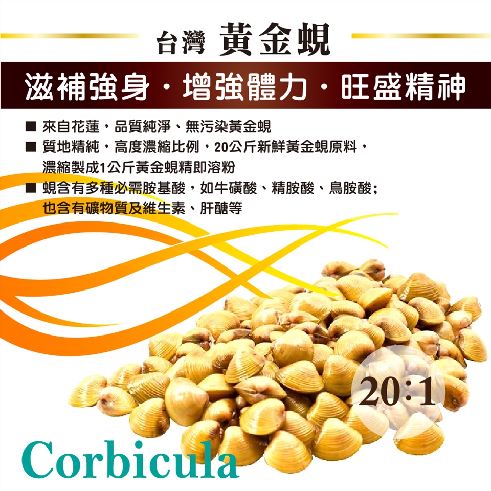 【台灣黃金蜆】:來自花蓮,品質純淨、無污染黃金蜆,以20公斤新鮮黃金蜆濃縮製成1公斤蜆精即溶粉