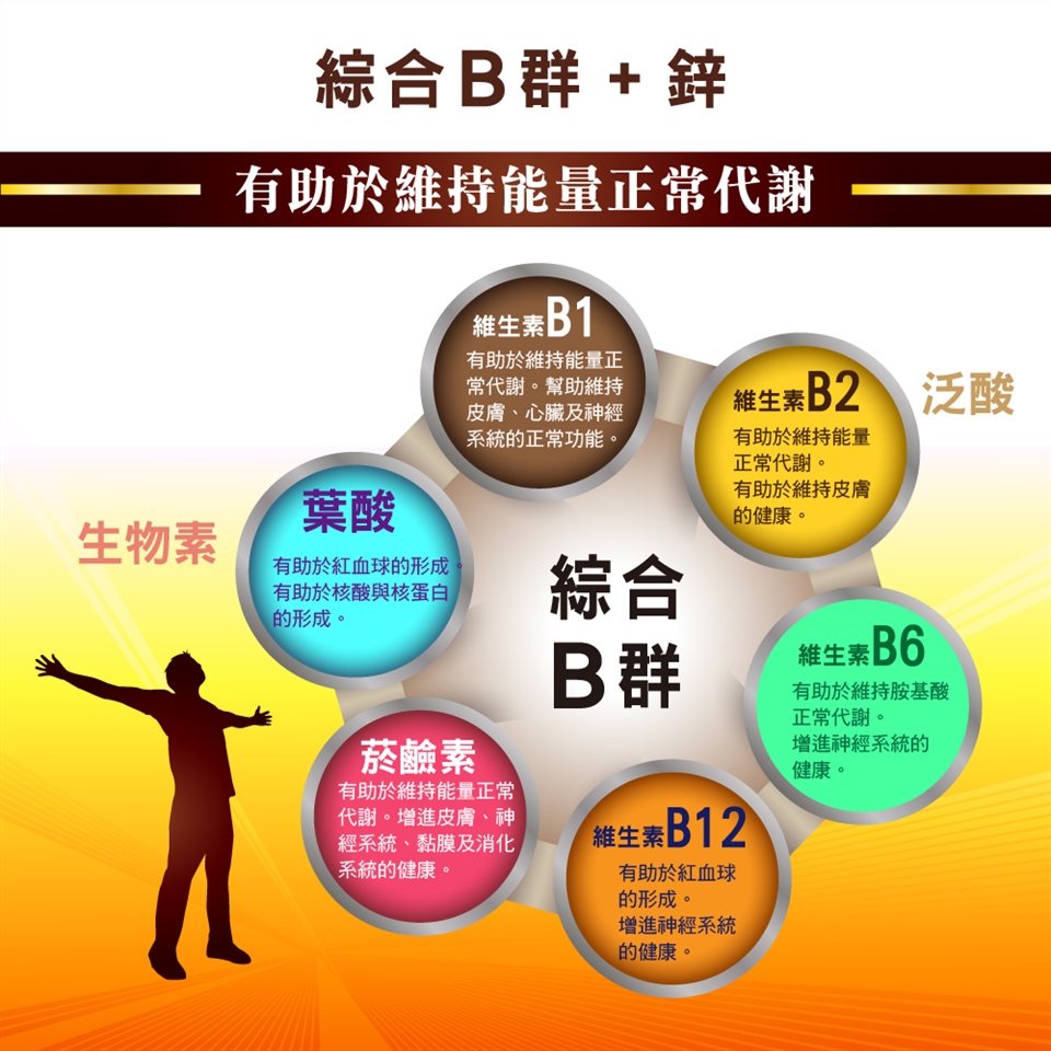 【綜合B群】: B1、B2、B6、B12、菸鹼素、泛酸、葉酸、生物素等營養素,