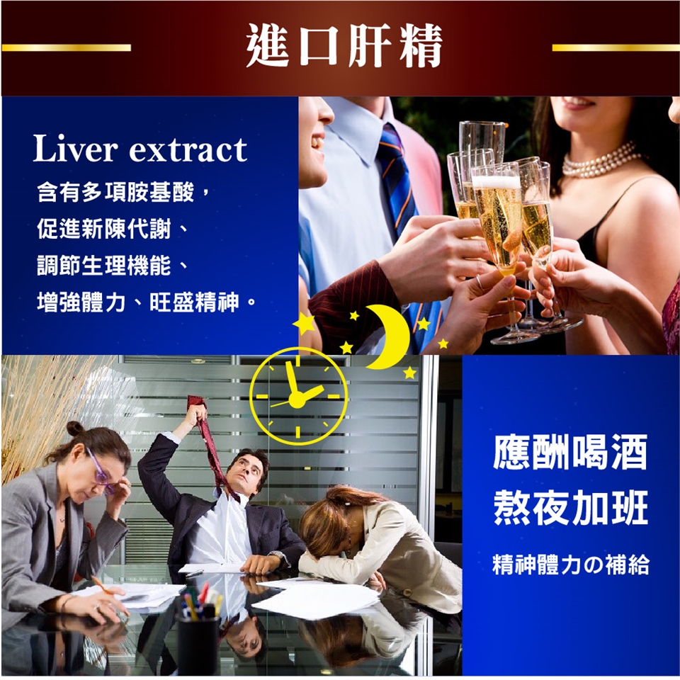 【進口肝精】:含有多項胺基酸,幫助促進新陳代謝、調節生理機能、旺盛精神。