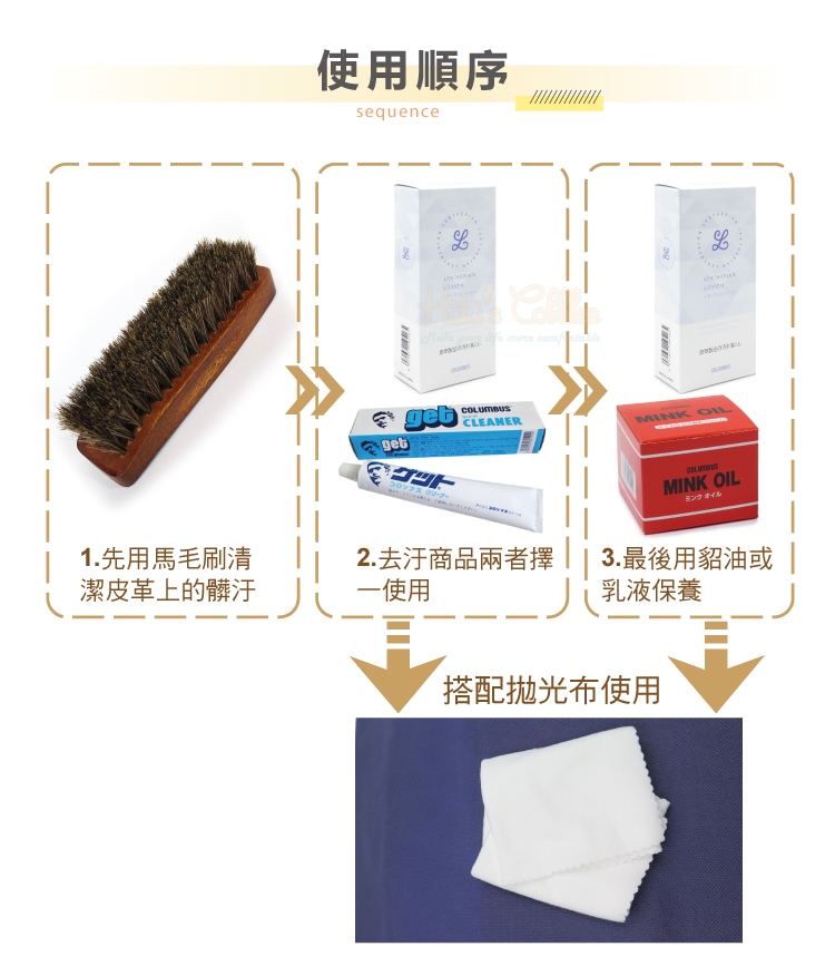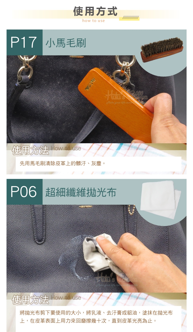 1.倒適量於柔軟的布上 2.輕輕擦拭推展於皮革上