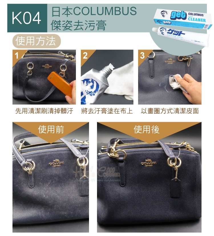 2.使用Columbus傑姿皮革去污膏,略施力氣先將皮面擦拭一遍; 此時您會發現您手中的布變 得很髒(視您皮革髒污的程度), 然後再重覆使用一次去污膏,再擦一次,直到乾淨為止。