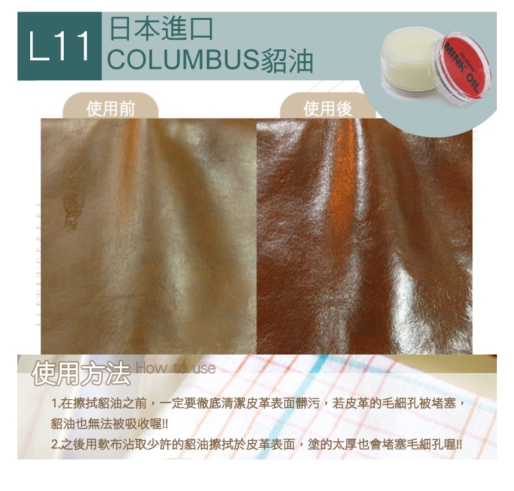 1.在擦拭貂油之前,一定要徹底清潔皮革表面髒污,若皮革的毛細孔被堵塞, 貂油也無法被吸收喔!! 2.之後用軟布沾取少許的貂油擦拭於皮革表面,塗的太厚也會堵塞毛細孔喔!!