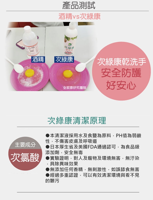 A:次綠康清潔液主成分為食鹽,PH屬就是弱鹼性次氯酸水,其優點就是低殘留,其還原的特性,故無法永久保持清潔效果,需重覆噴灑以形成持續清潔效果,另外也有其效期之限制。