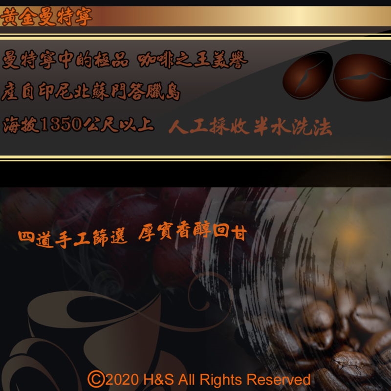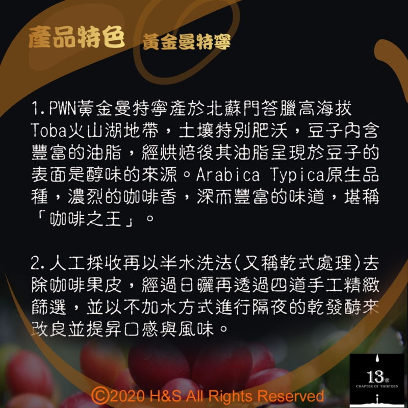 1.PWN黃金曼特寧產於北蘇門答臘高海拔Toba火山湖地帶,土壤特別肥沃,豆子內含豐富的油脂,經烘焙後其油脂呈現於豆子的表面是醇味的來源。Arabica Typica原生品種,濃烈的咖啡香,深而豐富的味道,堪稱「咖啡之王」。