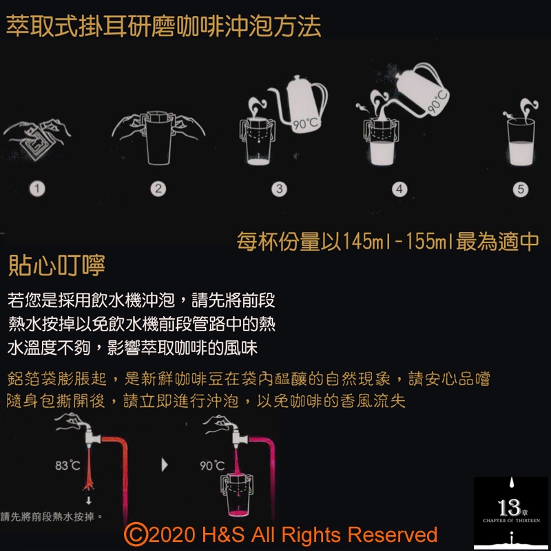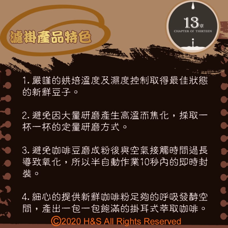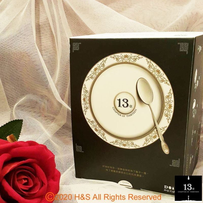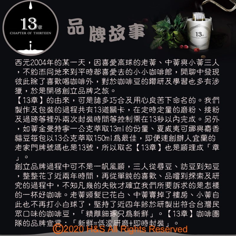 【13章】的由來,可是諸多巧合及用心良苦下命名的。我們製作及包裝的過程共有13道關卡,在定時定量的磨粉、接粉及過磅等裡外兩次封裝時間等控制需在13秒以內完成。另外,如黃金曼特寧一公克萃取13ml的份量、夏威夷可娜與麝香貓豆每包以13公克萃取150ml為最佳,即便連創辦人宜蘭的老家門牌號碼也是13號,所以取名【13章】也是順理成「章」。