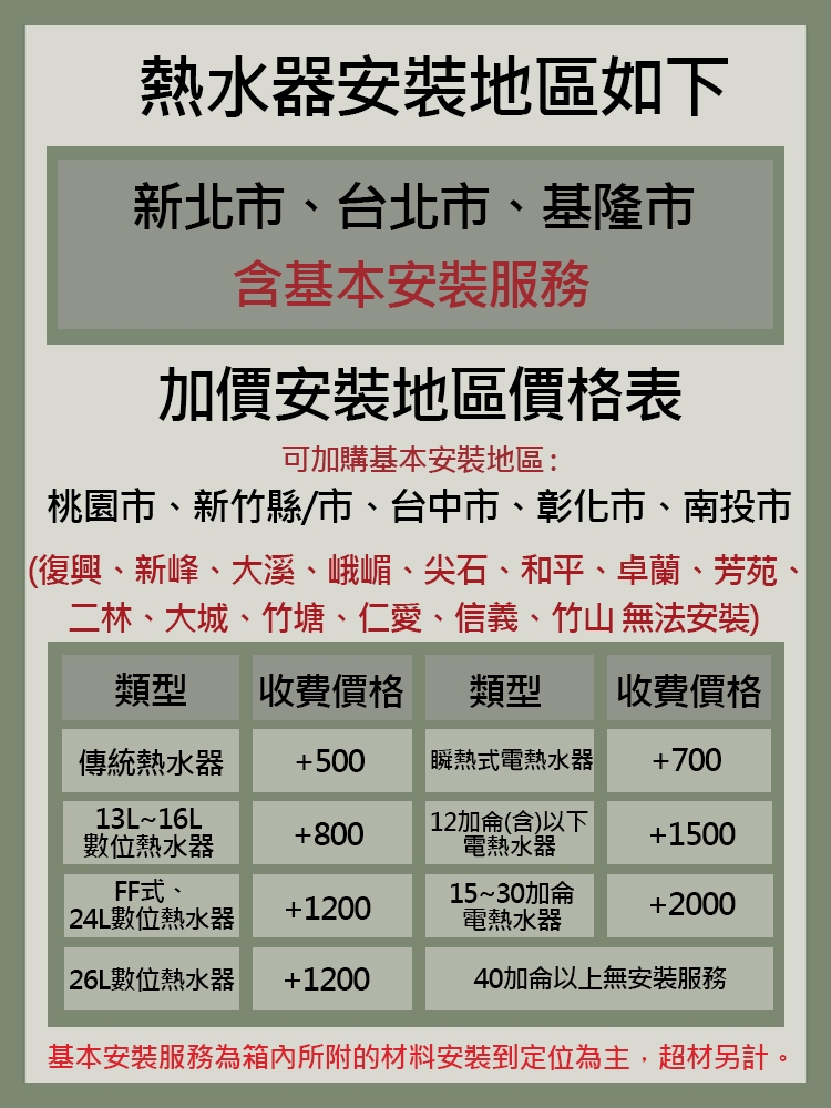 •下訂單前請先確認好家中位置尺寸,或可來電詢問,若安裝人員到現場因氣別或尺寸不合無法安裝,則需酌收工本費400元整。br/br/•標準安裝為箱子內原廠所附的材料安裝到定位,若現場有超材則依現場環境為主實做實收。br/br/•本產品一經安裝即無法進行退貨。