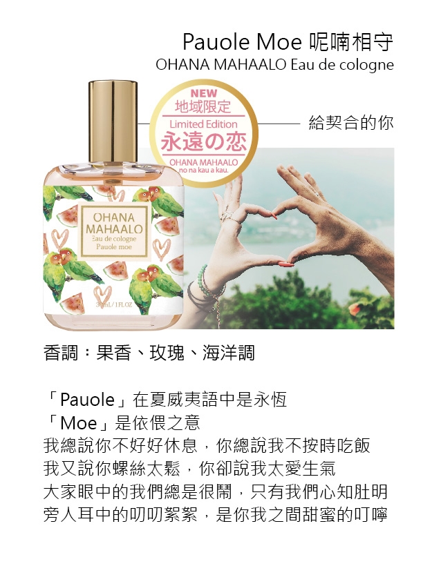 Pauole在夏威夷語中是“永恆”,Moe是“依偎”之意,我總說你不好好休息,你總說我不按時吃飯,