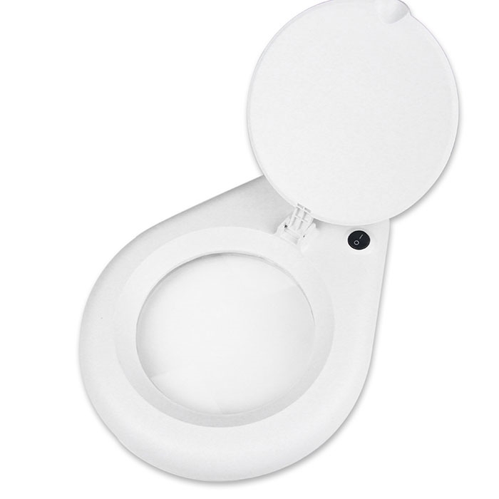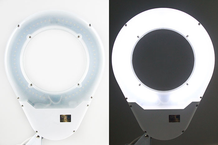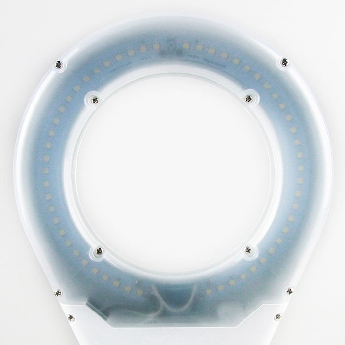 大鏡面的放大鏡加上明亮的光源,組合成檯燈放大鏡,又稱為工作放大燈。內部電路採電子式變壓器,不會產生閃爍燈光。