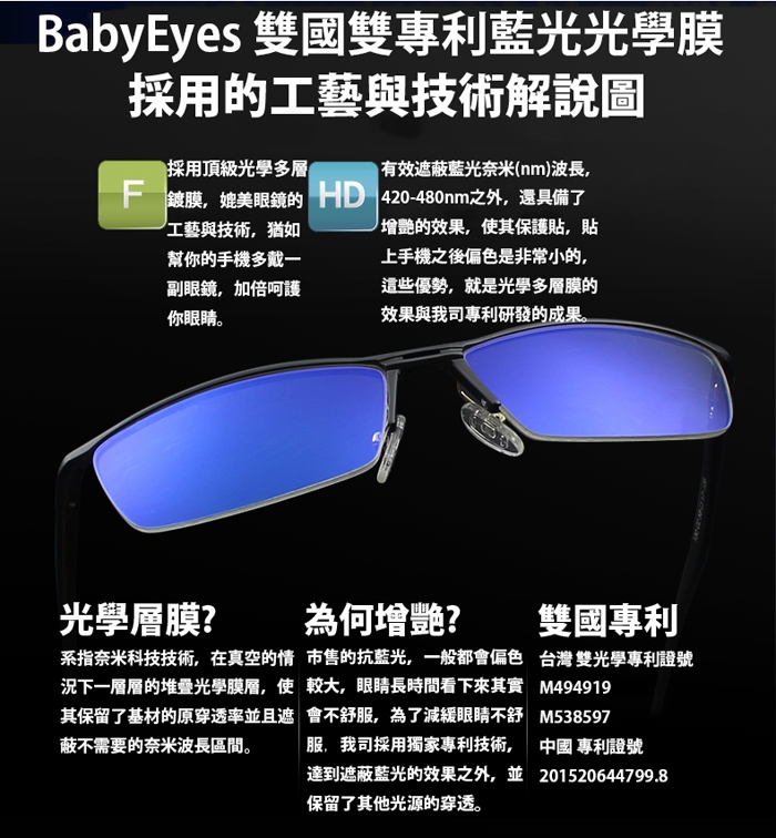 台灣製雙光學奈米多層鍍膜專利,媲美眼鏡光學工藝、媲美APP藍光濾波器,