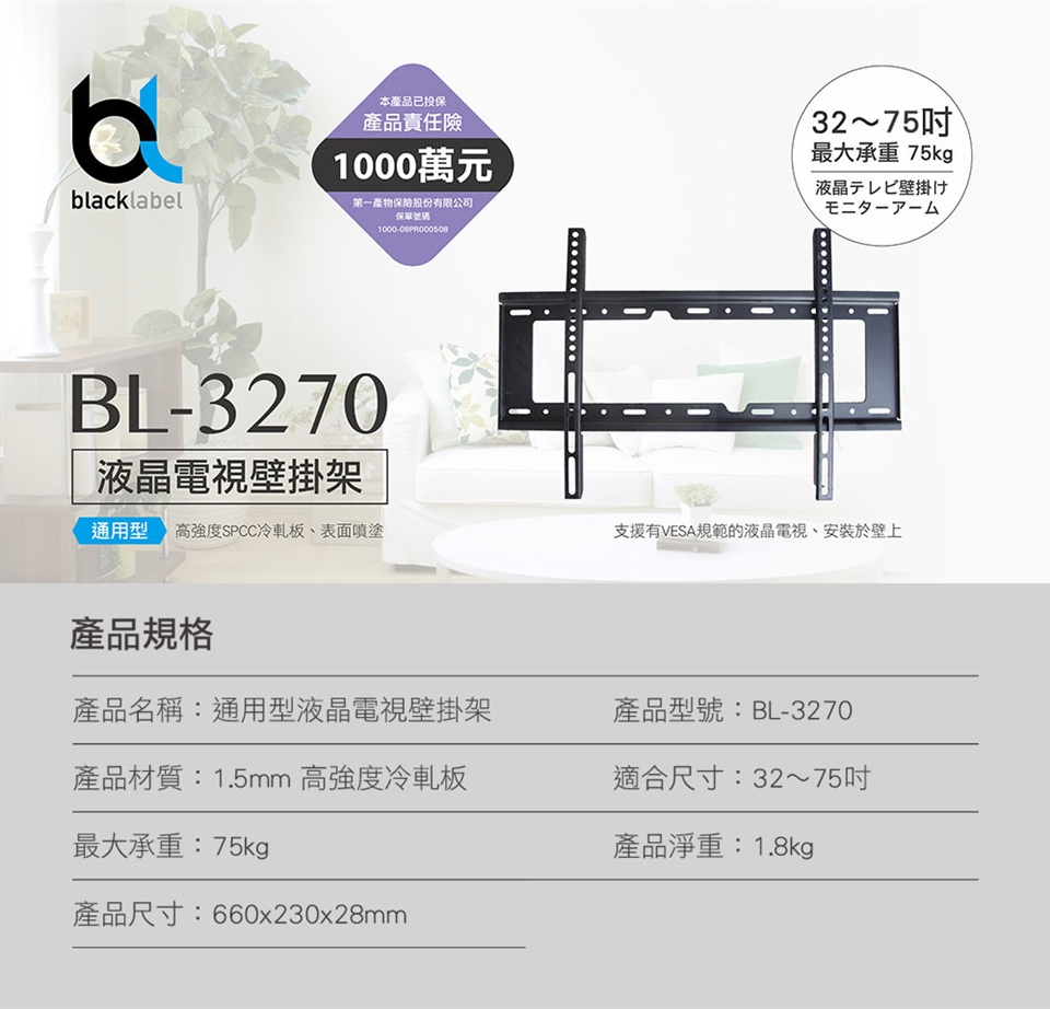 blacklabel 通用型液晶電視壁掛架 BL-3270 (適用32吋以上)