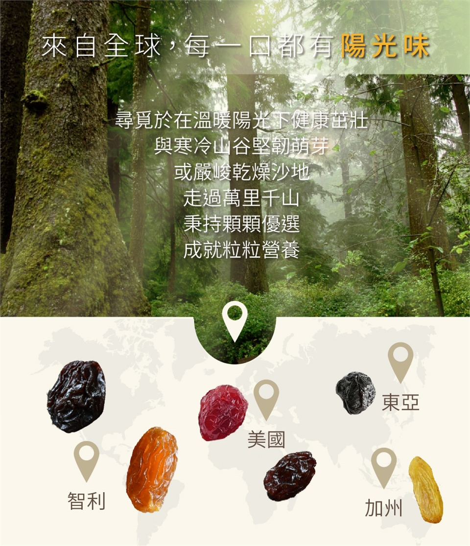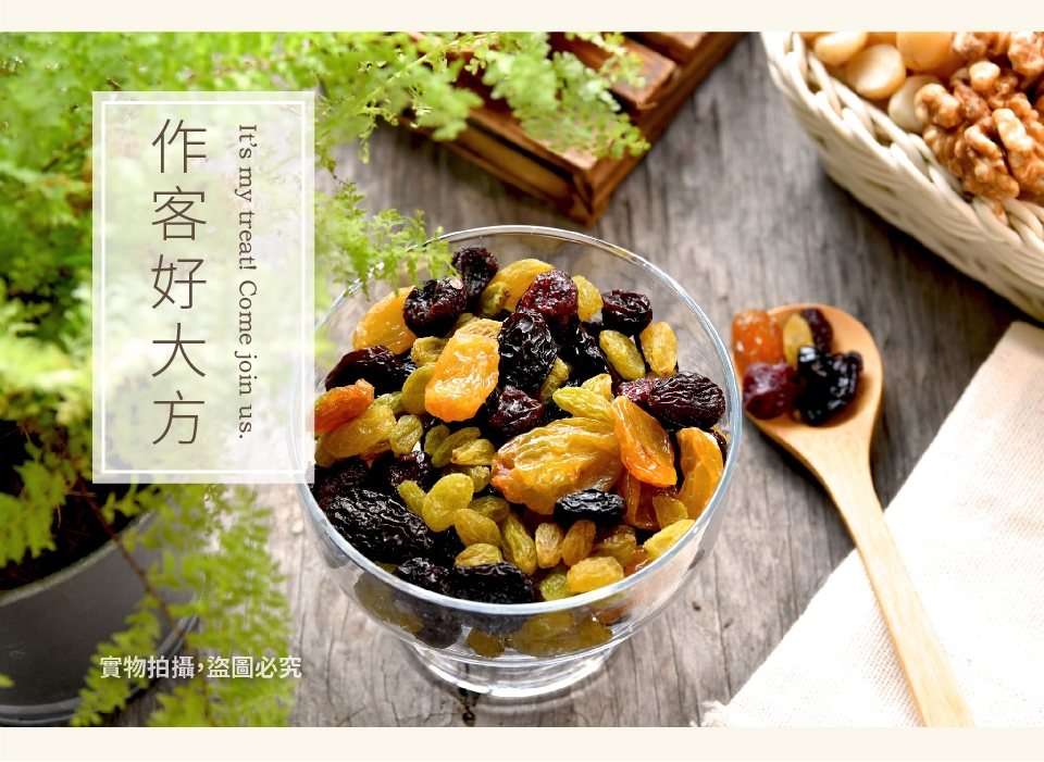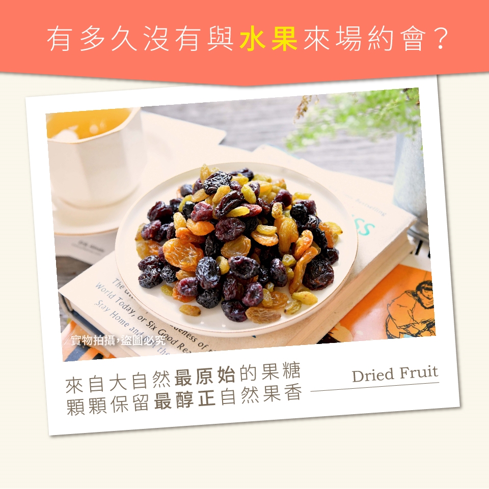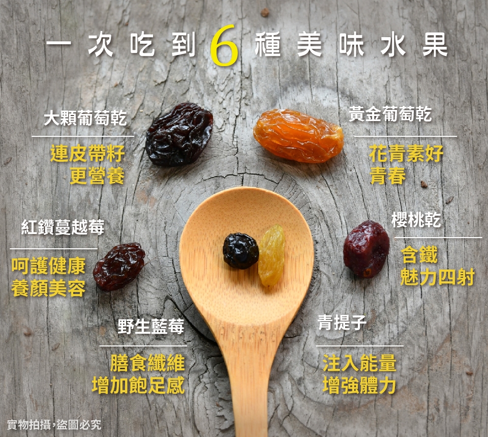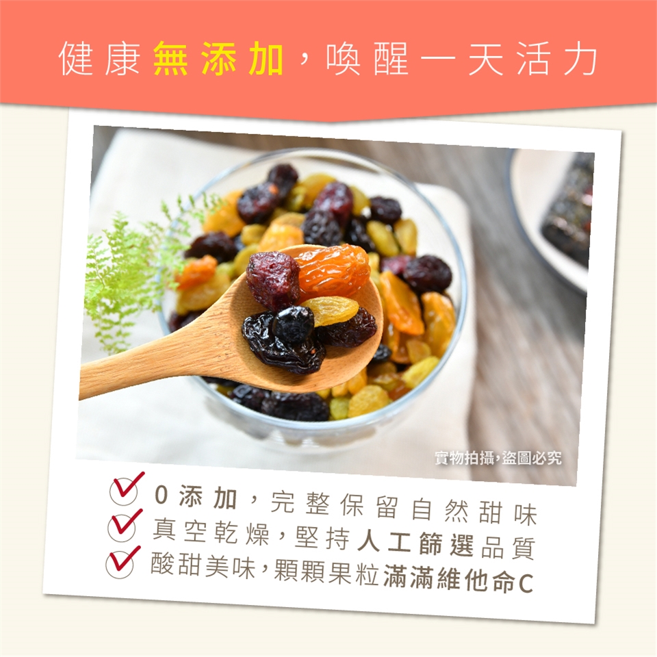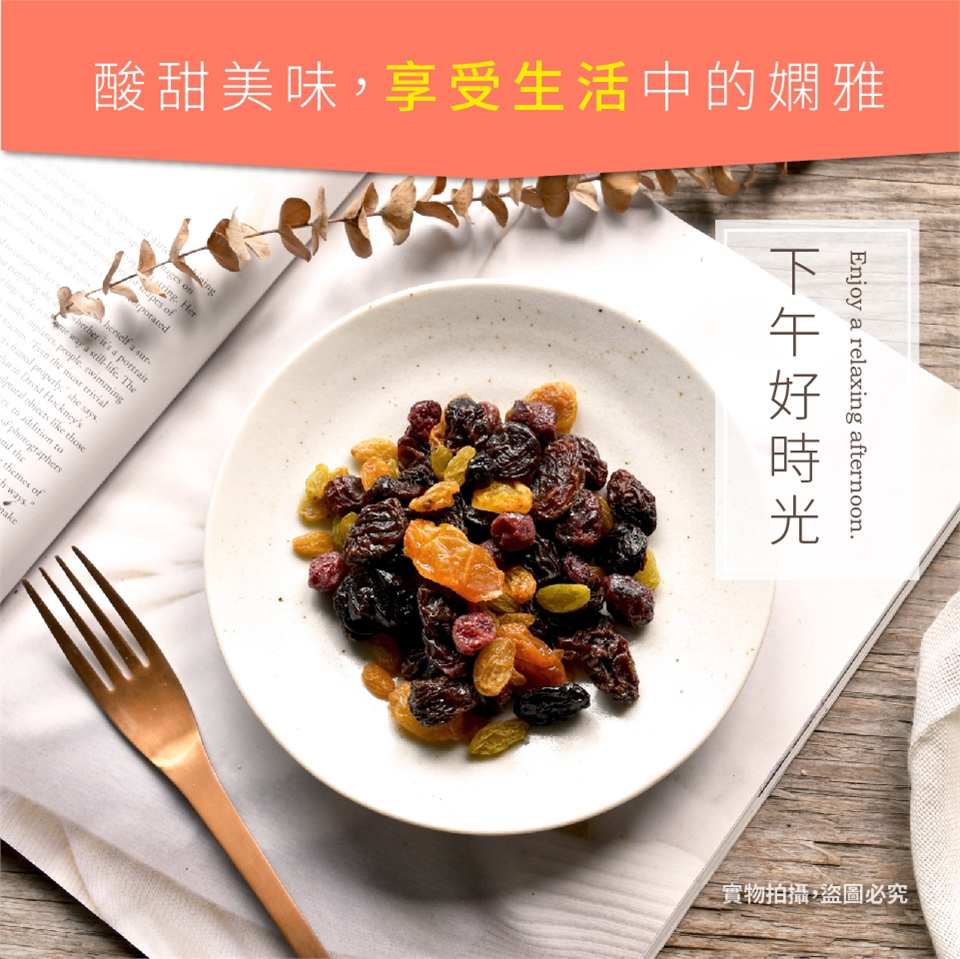 成份:黃金葡萄乾、黑葡萄乾、青提子、蔓越莓、藍莓、櫻桃乾