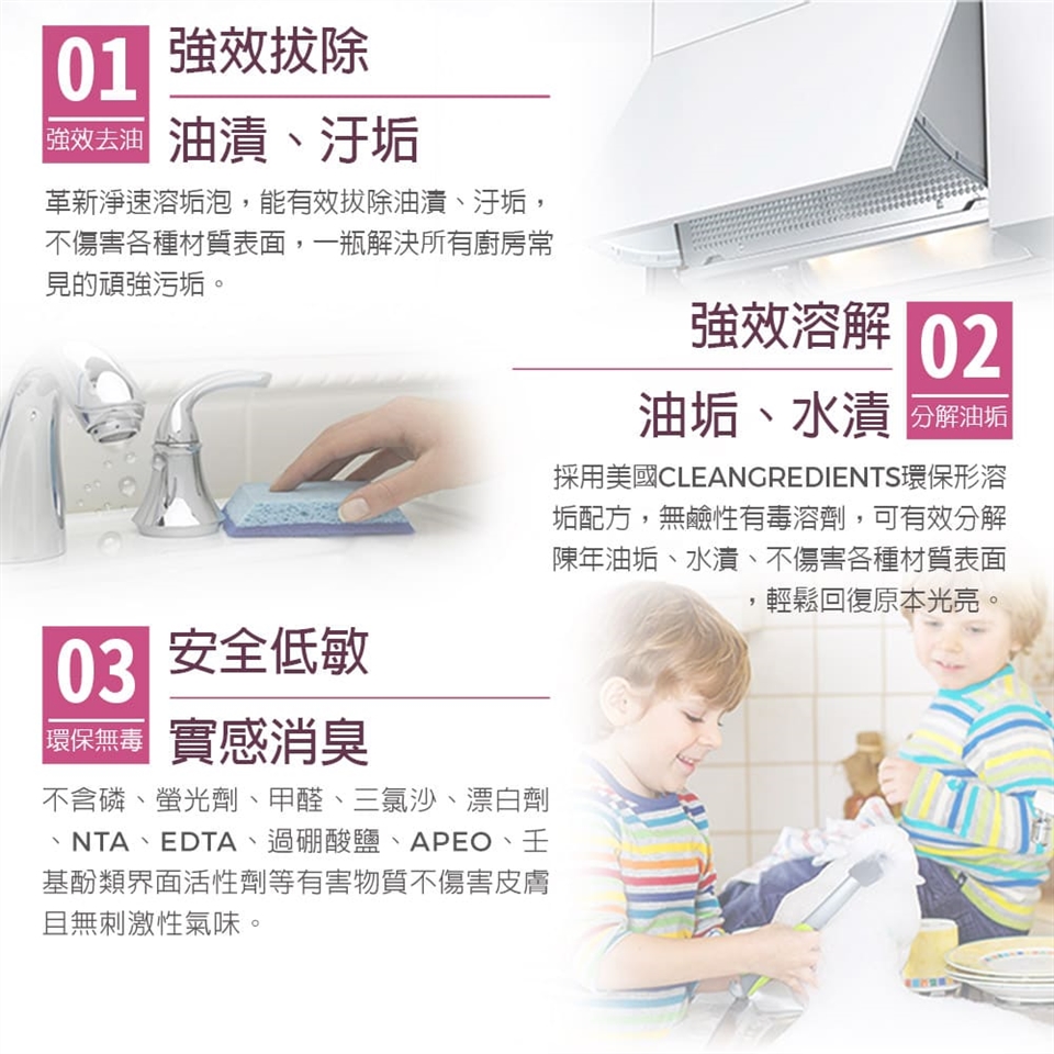 採用天然淨速溶垢泡與接骨木精油,能迅速分解油垢與髒污,清潔更輕鬆。