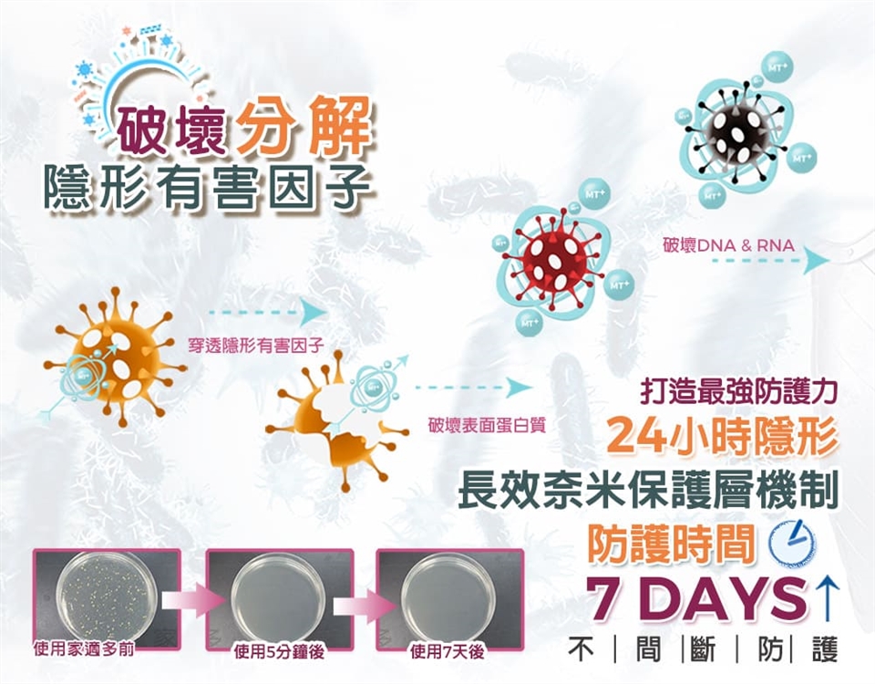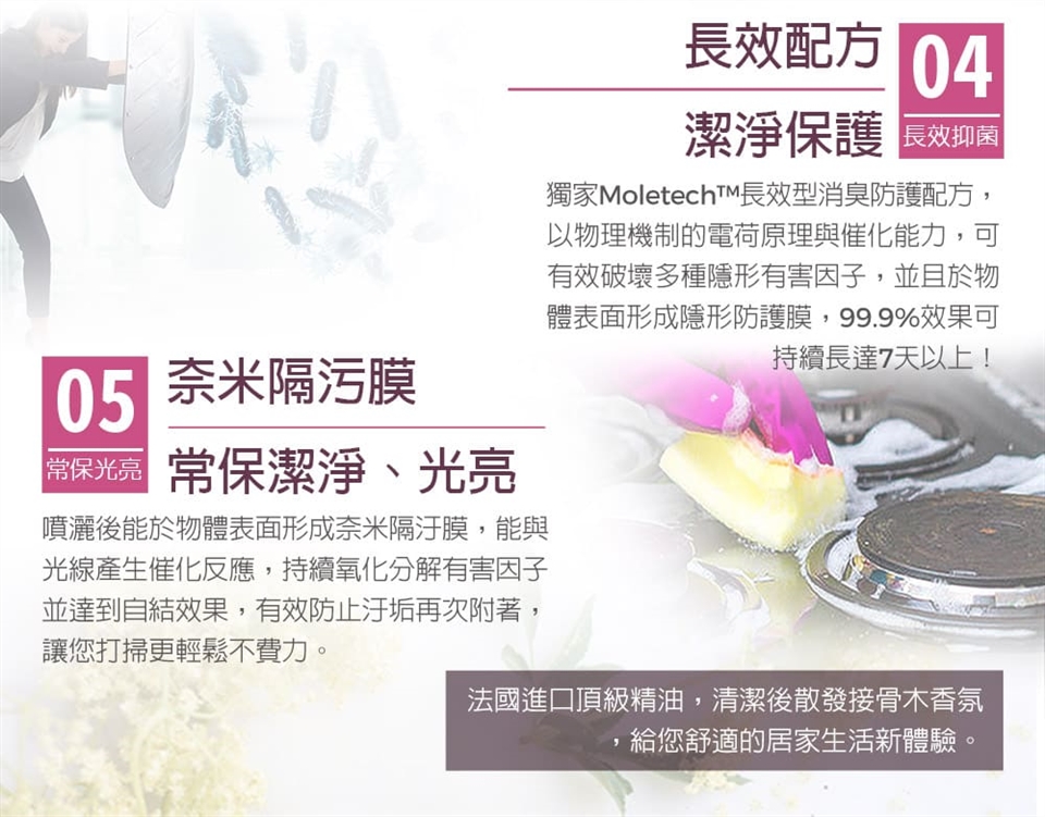 內含 MOLETECH™長效型消臭防護配方,在物體表面形成奈米保護膜,減少髒污再次附著,維持潔淨。
