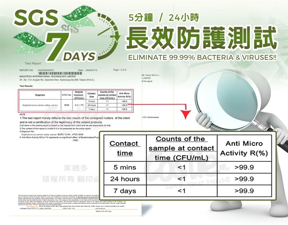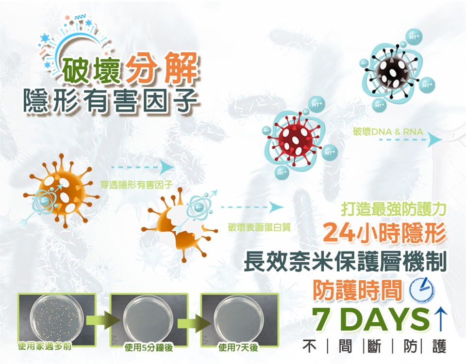 MOLETECH™長效型消臭防護配方,以物理性原理分解異味分子,同時在表面形成奈米保護層,延緩污垢再次附著。