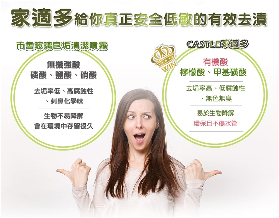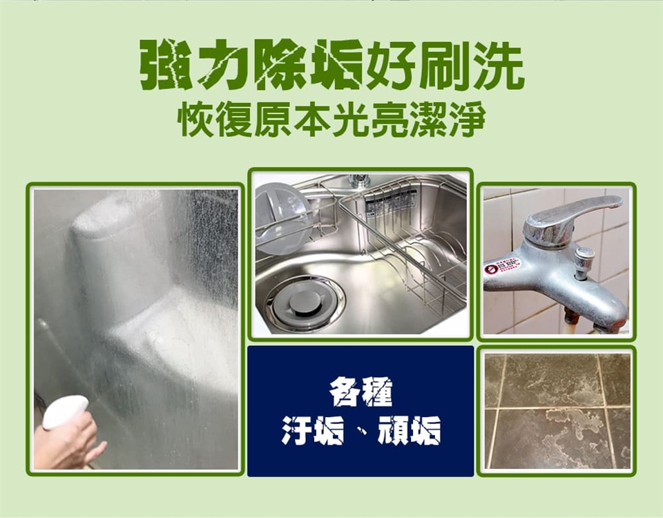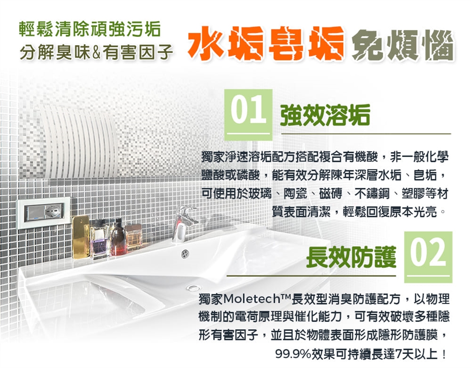 採用獨家「天然有機酸淨速溶垢配方」,非一般化學鹽酸或磷酸,能有效分解陳年皂垢、水垢,輕鬆去除頑垢。