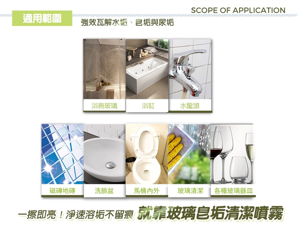 浴室玻璃、淋浴門、磁磚地磚、洗臉盆、水龍頭、馬桶內外、玻璃器皿、廚房不鏽鋼槽等多種表面皆適用。