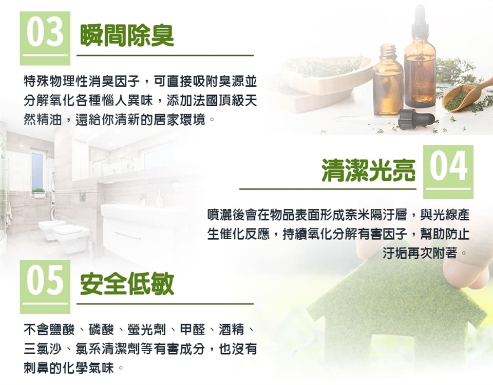 成 分:去離子水、MOLETECH™長效型消臭防護配方、天然淨速溶垢泡、有機酸、精油