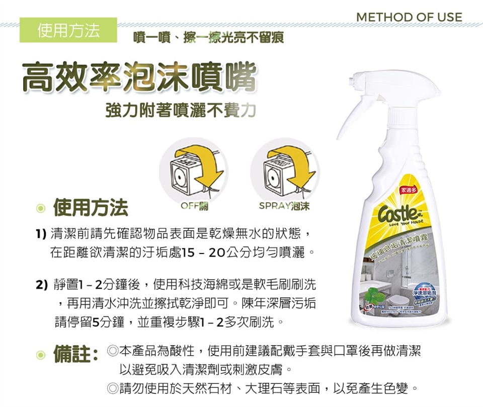 A2:建議於頑垢區域噴灑後靜置30秒,再以海綿或抹布擦拭,視情況以清水略沖即可。