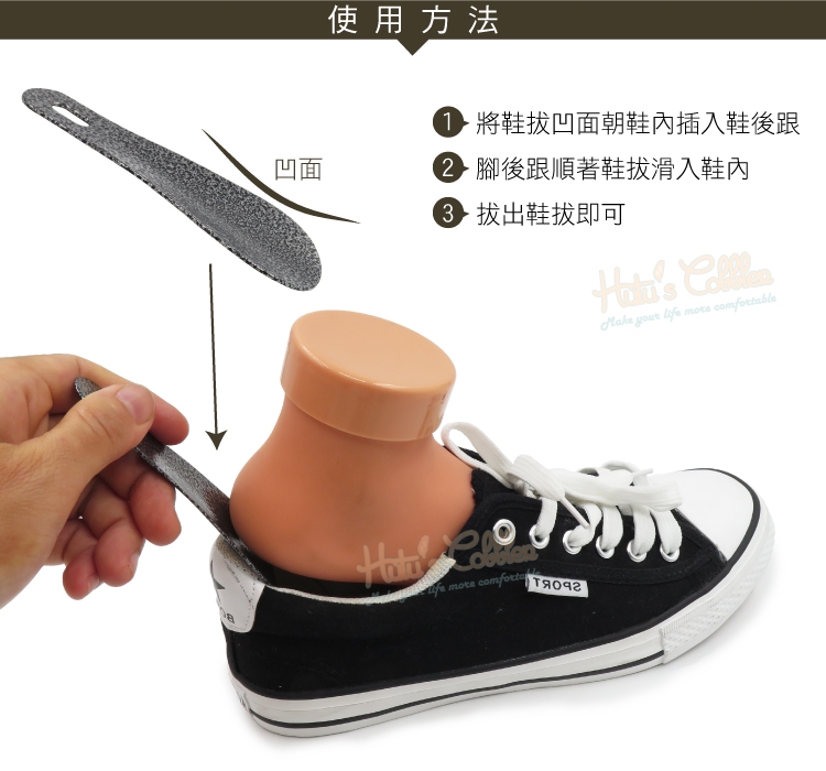 1.將鞋拔凹面朝鞋內插入鞋後跟