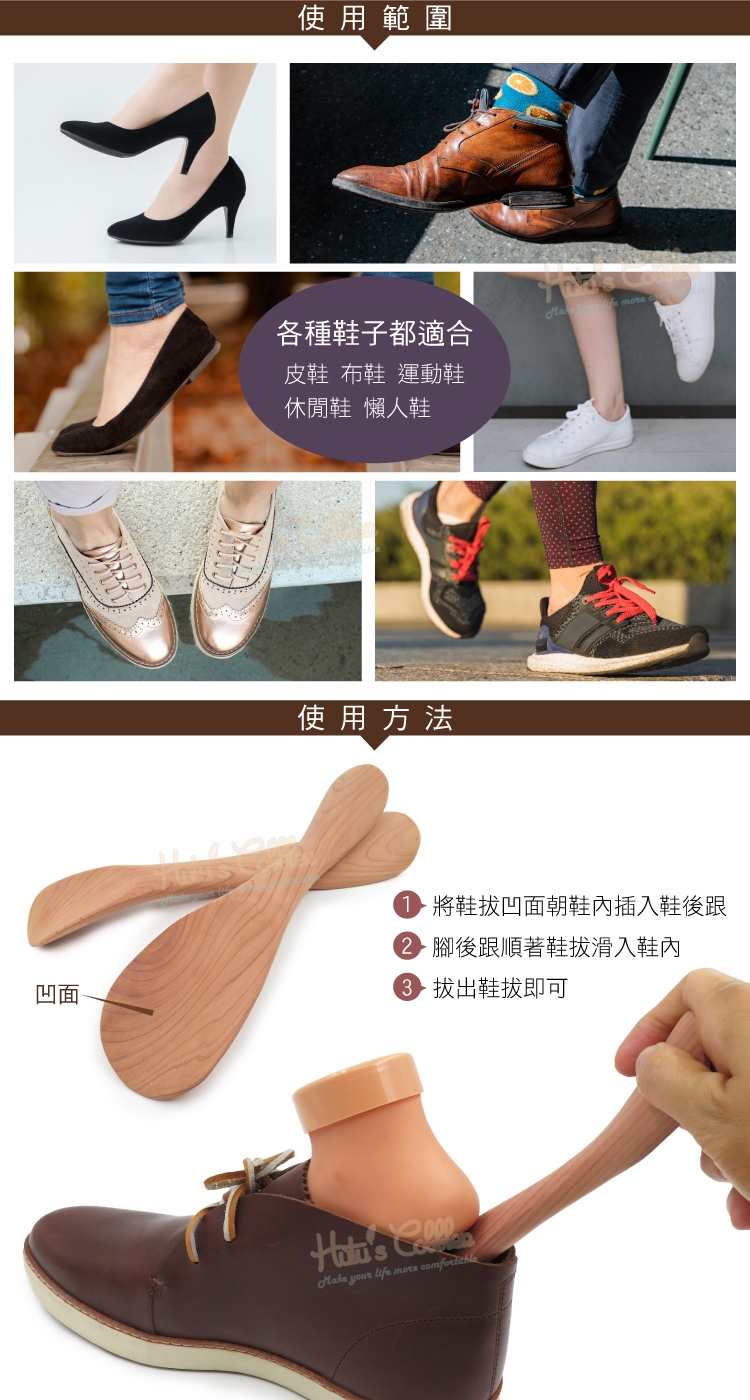 1.將鞋拔凹面朝鞋內插入鞋後跟
