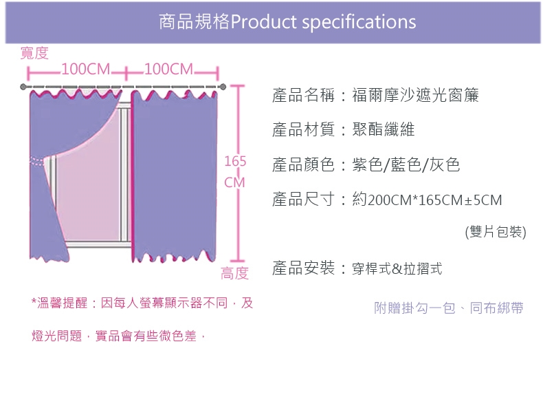 ※單片寬約100x高165cm(±5cm)x2片組合成=寬200cmx高165cm的窗簾