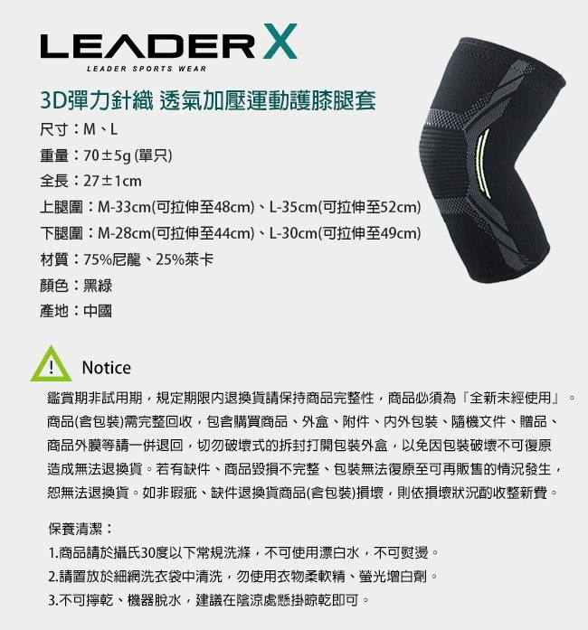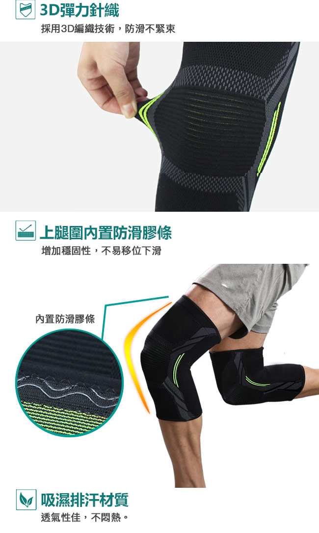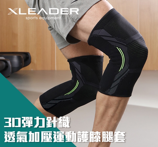 Leader X 3D彈力針織 透氣加壓運動護膝腿套 黑綠