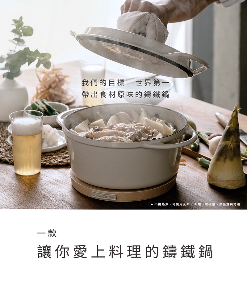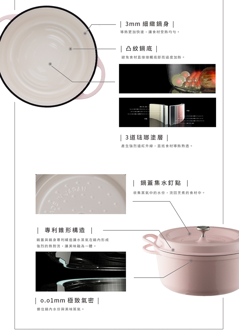 日本職人手工鑄造,極高氣密性傳導性,鑄守食物鮮甜,不挑熱源,無添加鎘、鉛與錳。