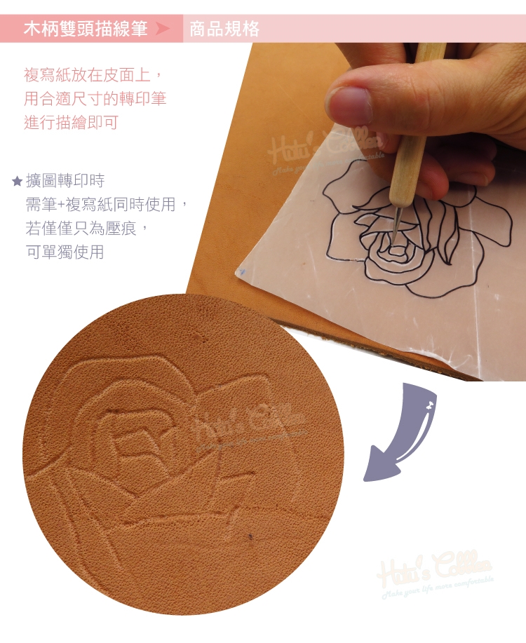 複寫紙放在皮面上,用合適尺寸的轉印筆進行描繪即可