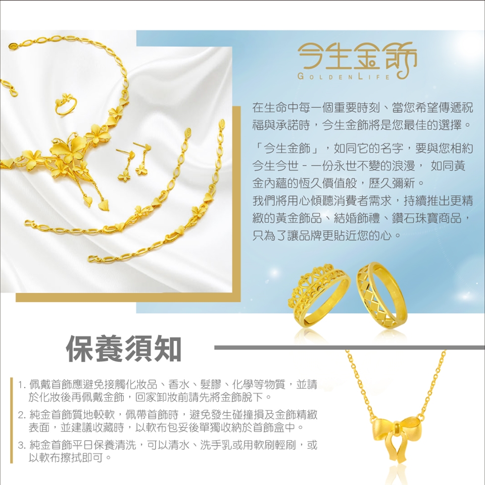 黃金具有延展、可塑性高的材質,如:做家事、游泳、泡溫泉等休閒活動,建議先取下,待活動結束時再配戴,以維持商品狀態。