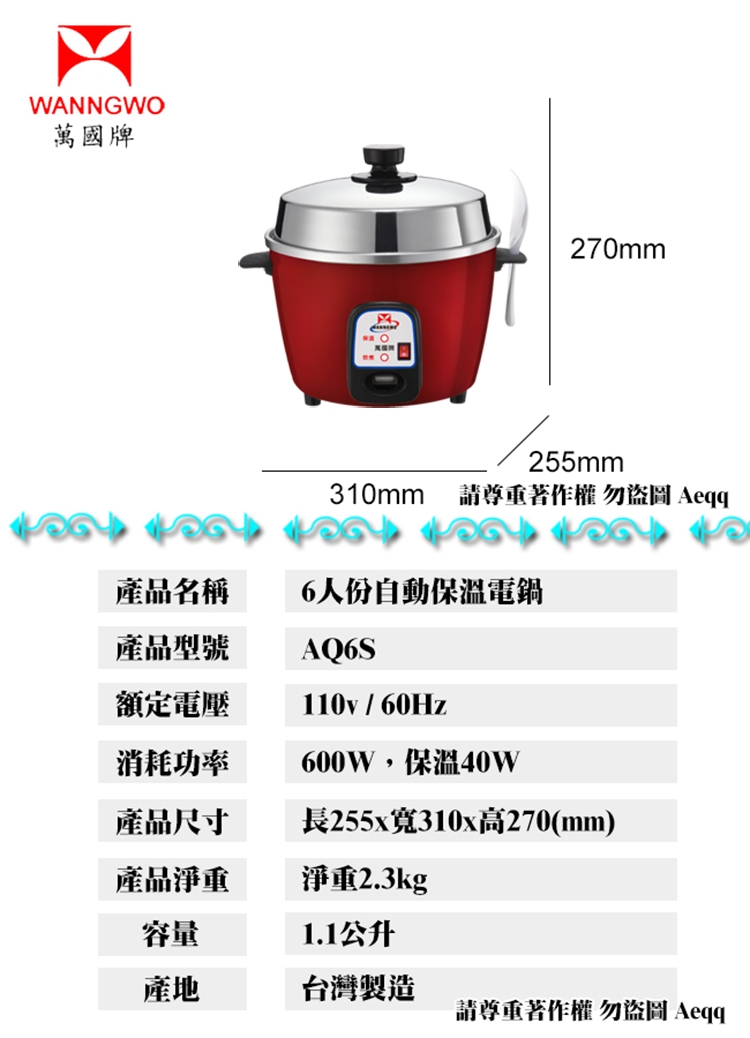 【萬國牌】6人份自動保溫電鍋(AQ-6S/AQ6S)