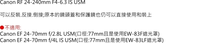 ●【品名】JJC佳能Canon副廠LH-78F相容Canon原廠EW-78F遮光罩適RF 24-240mm f/4-6.3 IS USM