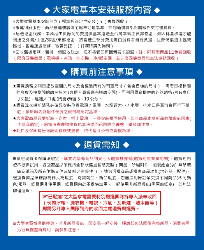 大型家電商品為配合物流商防疫規範,安裝時程約須7~14個工作天。