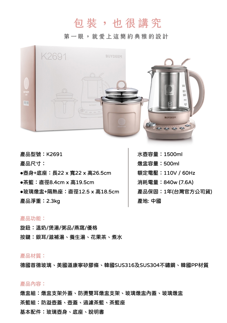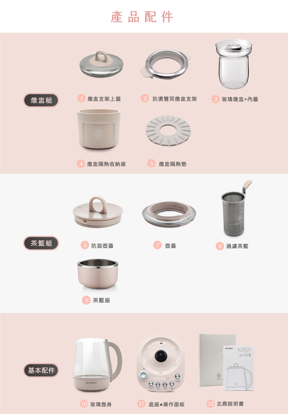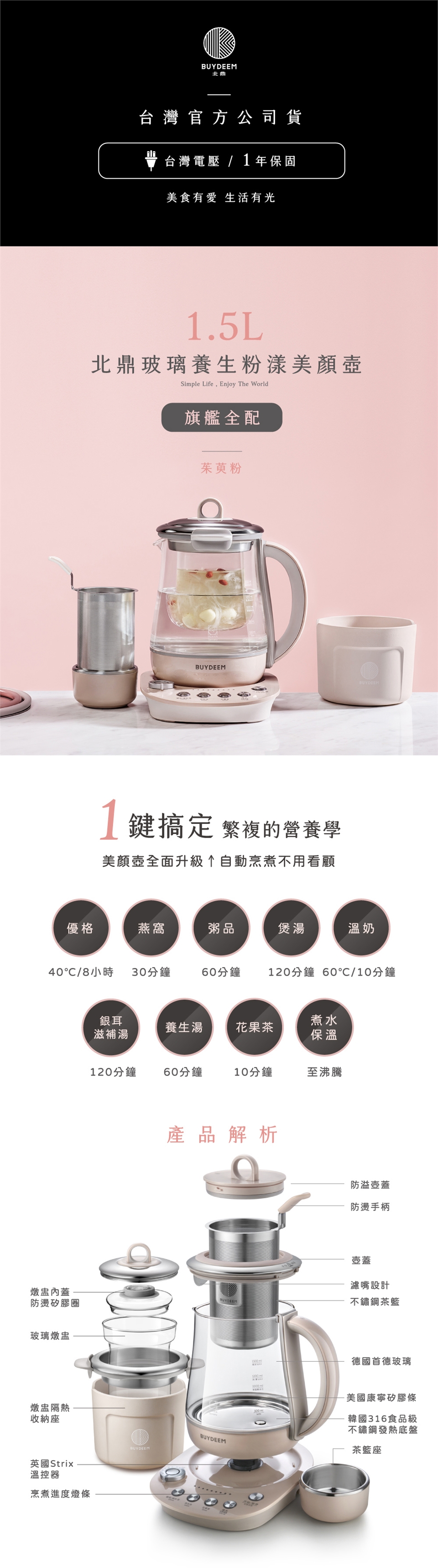 BUYDEEM北鼎玻璃養生快煮壺-粉漾美顏壼-旗艦全配版-K2691-茱萸粉