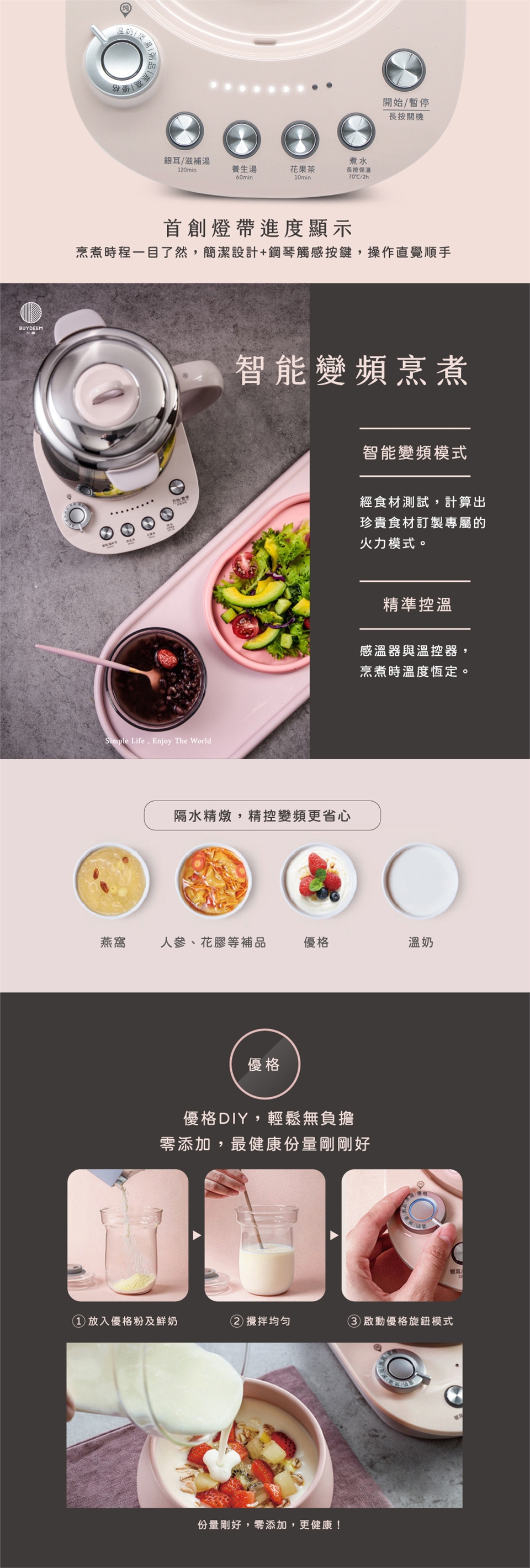 ●9種茶湯模式:優格、燕窩、粥品、煲湯、溫奶、銀耳滋補湯、養生湯、花果茶、煮水,一壺多用,告別擁擠廚房!