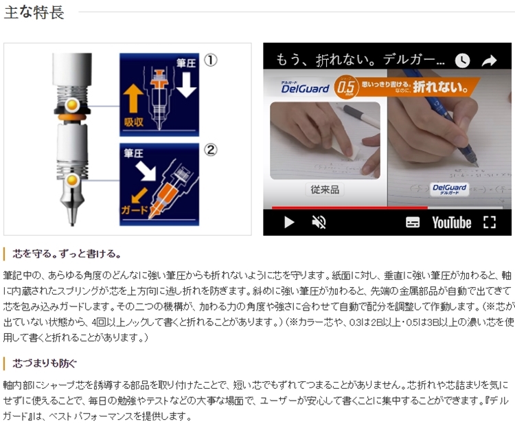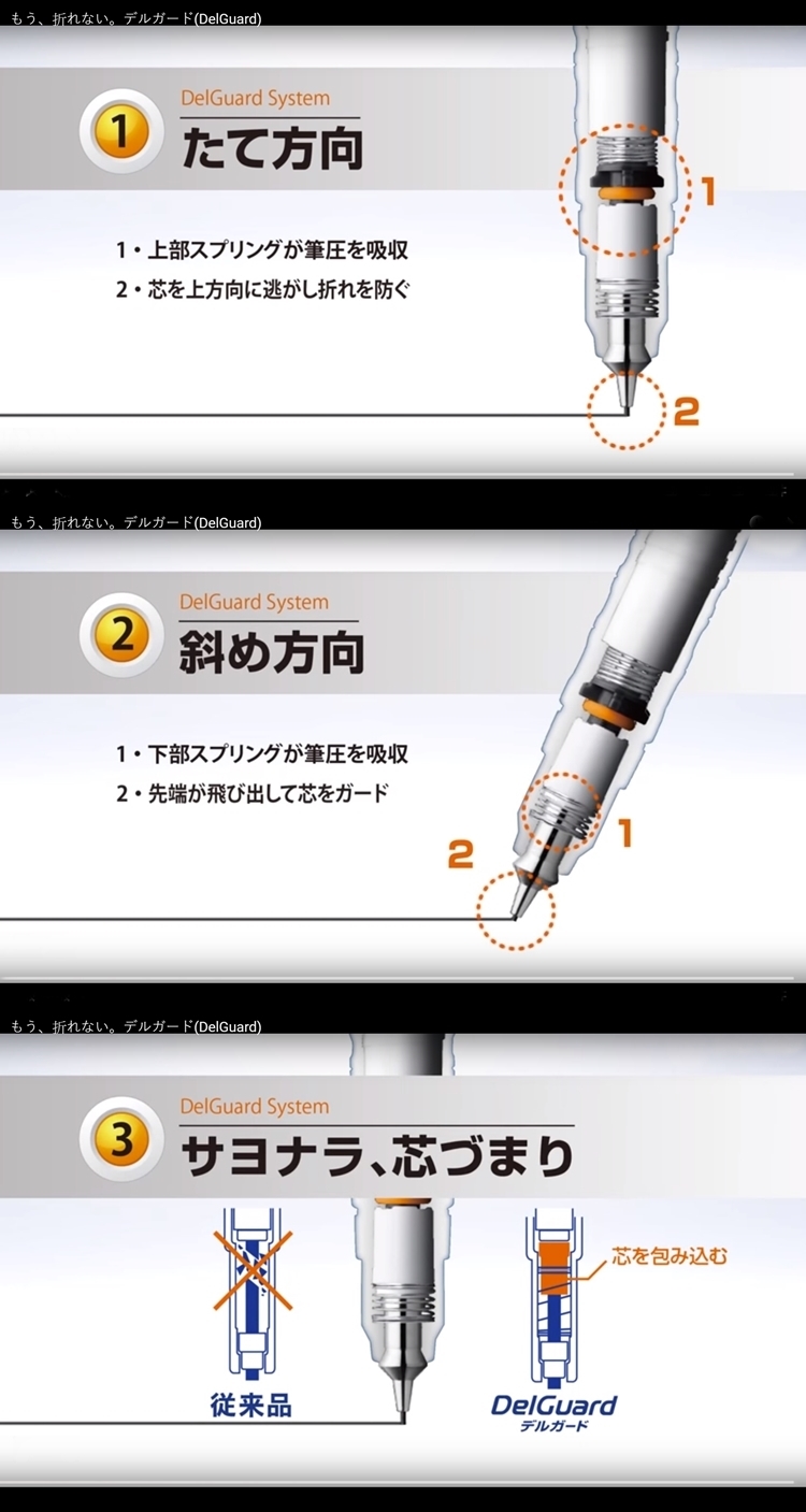 ●專利DelGuard結構設計,可多角度書寫,分散書寫時的筆壓,快速筆記或是大力塗卡時也很穩定,多角度書寫時也不斷芯喔