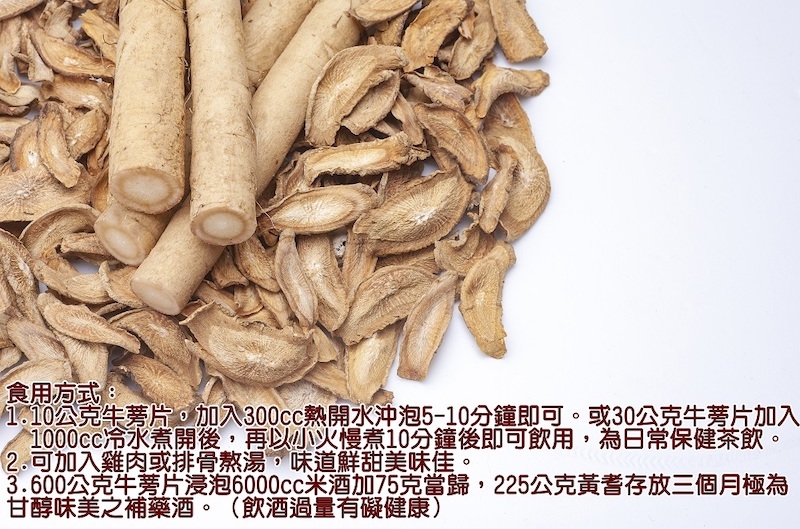 1.10公克牛蒡片,加入300cc熱開水沖泡5-10分鐘即可。或30公克牛蒡片加入