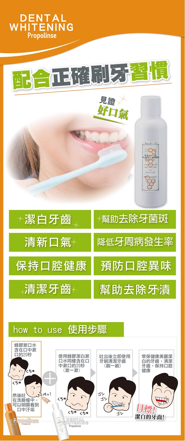 取約1/2瓶蓋的量(10-15ml)倒入口中,漱口20~30秒後,再以牙刷刷牙。
