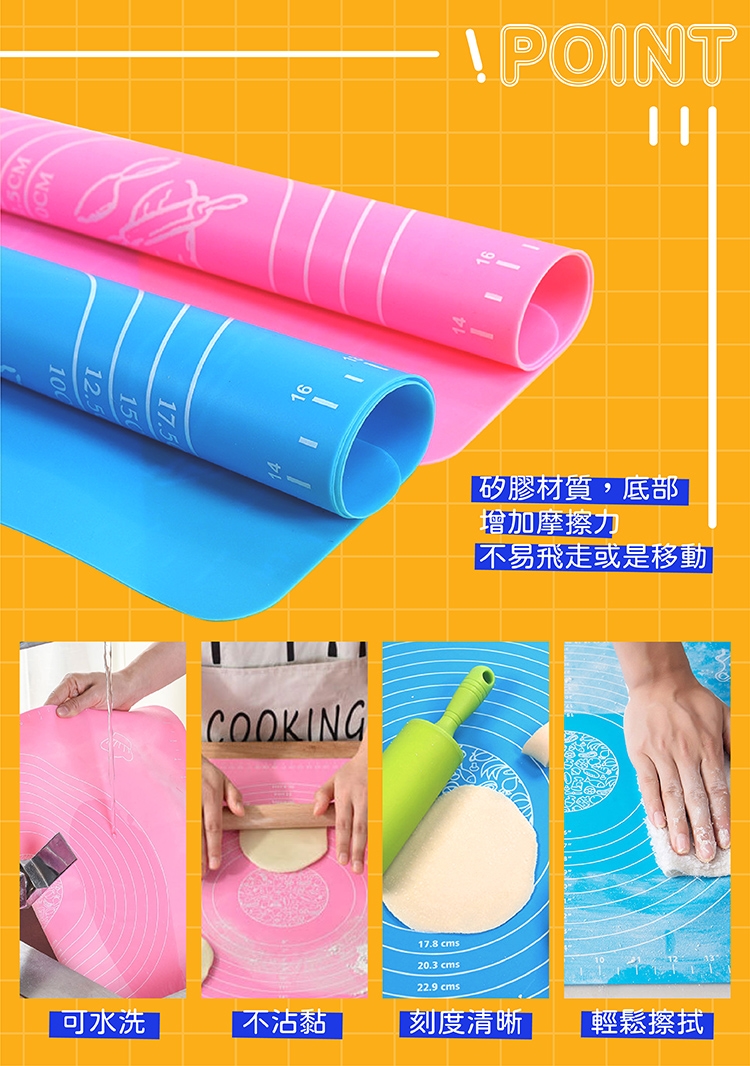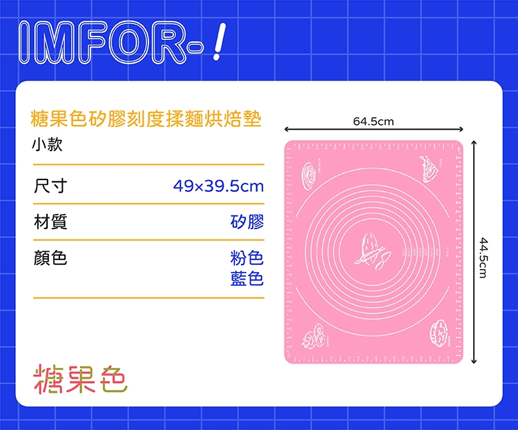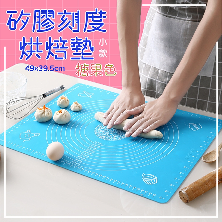商品詳細介紹 糖果色矽膠刻度揉麵烘焙墊/擀麵墊/烘焙工作墊(1入)※角落白色花紋為隨機出色四邊刻度烘焙墊清晰量測矽膠材質,摺疊無痕跡49*39.5(CM),可水洗,潔淨衛生多重圓形適合測量各種餅皮大小適用各種中西式烘焙點心手續不沾粉,吸附力強,適用各種材質工作桌面 使用方法說明 請勿將產品送進烤箱 注意事項 請勿將產品送進烤箱