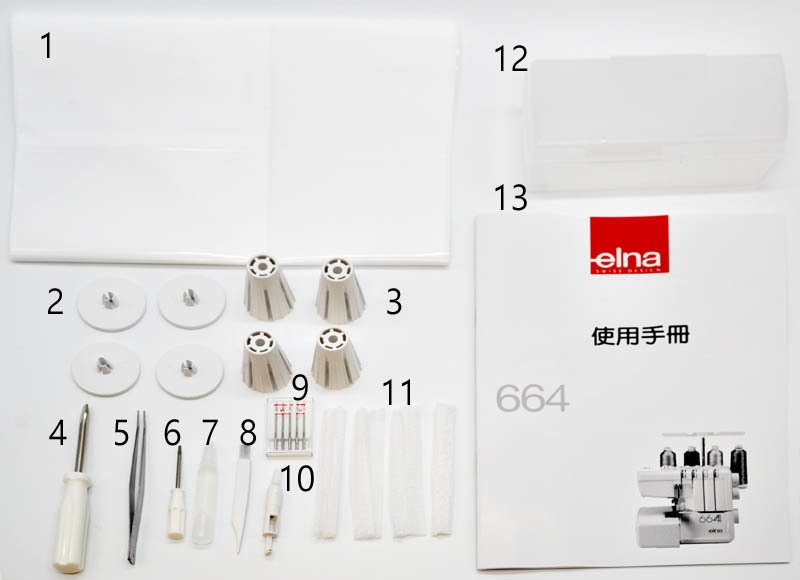 1.防塵罩、2.擋線板、3.上線固定器、4.螺絲起子(大)、5.夾子、6螺絲起子(小)、7.針車油、8.刷子、9.針及針盒、10.穿線器、11.線網、12.附屬品收納盒、13.使用手冊