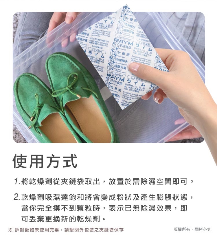 1.將乾燥劑取出,放置於需除濕空間即可。