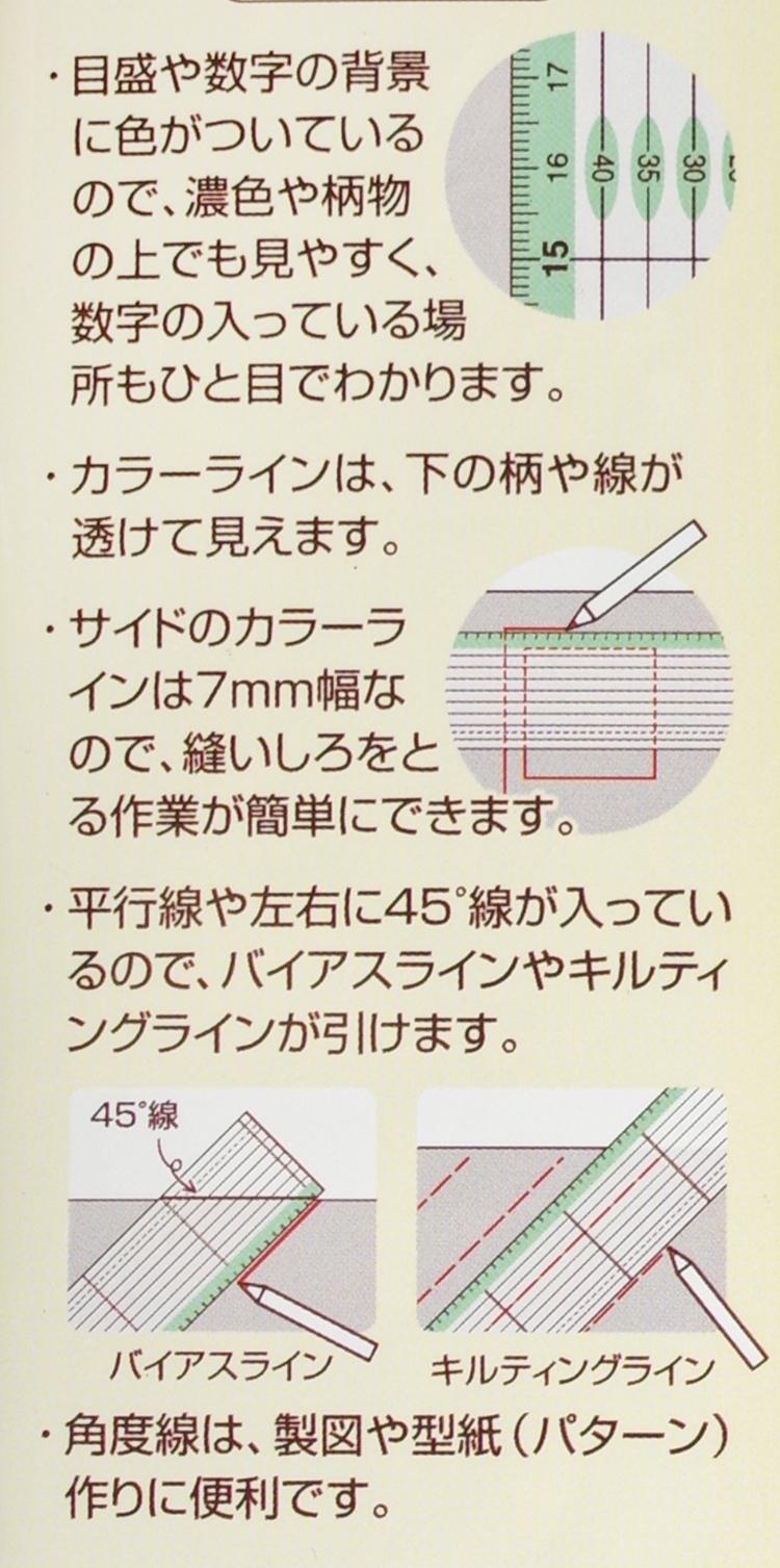 ●尺規上有顏色,在不同花色的布上更清楚易讀