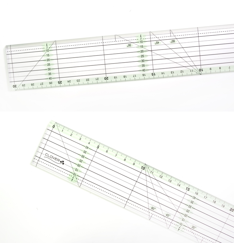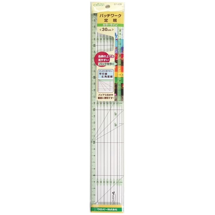 ●【品名】韓國製日本可樂牌Clover顏色拼布定規尺57-926(尺長30公分;尺邊斜角;有角度線)30cm分色線條長尺拼布尺適繪線條製圖樣縫份