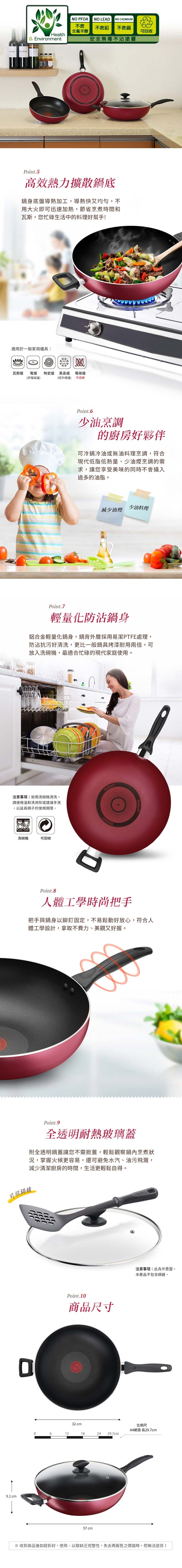 法國特福佳溫紅心技術,輕鬆掌握最佳烹調溫度,攝氏180度時紅心會改變顏色,熱鍋完成一看即知,可避免油煙,讓您烹調出美味又健康的好菜。