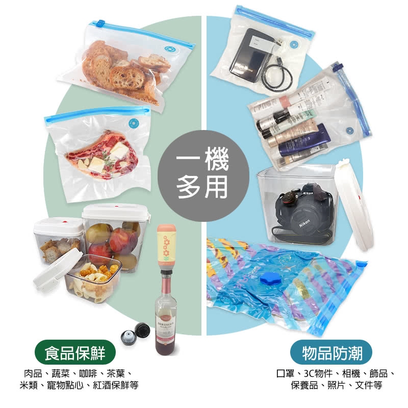 1.真空生鮮肉品:先把肉品用保鮮袋分裝好再依序置入食品袋中,切勿過分抽取避免抽入血水。 b2.真空海鮮類:先把尖刺用剪刀剪去,避免刺破袋體,依份量裝入小袋後,放入食品袋冷凍保存,一餐取出一份,很方便。 br/3.真空麥片等粉類:依份量裝入小袋後,放入食品袋抽取,勿讓粉塵汙染到氣閥貼紙,易導致漏氣產生。br/4.抽氣完成後再用手指按壓一下氣閥口, 讓氣閥貼紙更緊密。