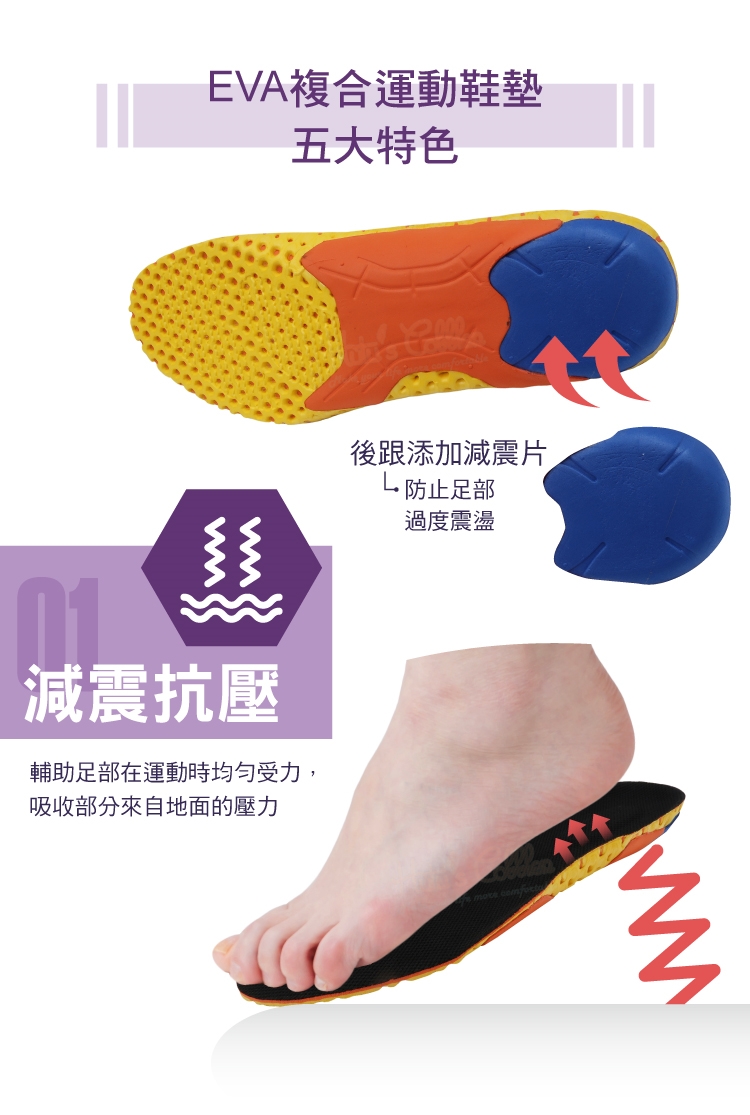 輔助足部在運動時均勻受力,吸收部分來自地面的壓力