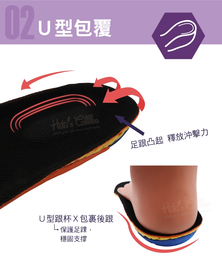 足跟凸起,釋放沖擊力,U型跟杯,包裹後跟,保護足踝,穩固支撐
